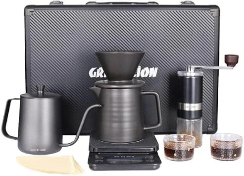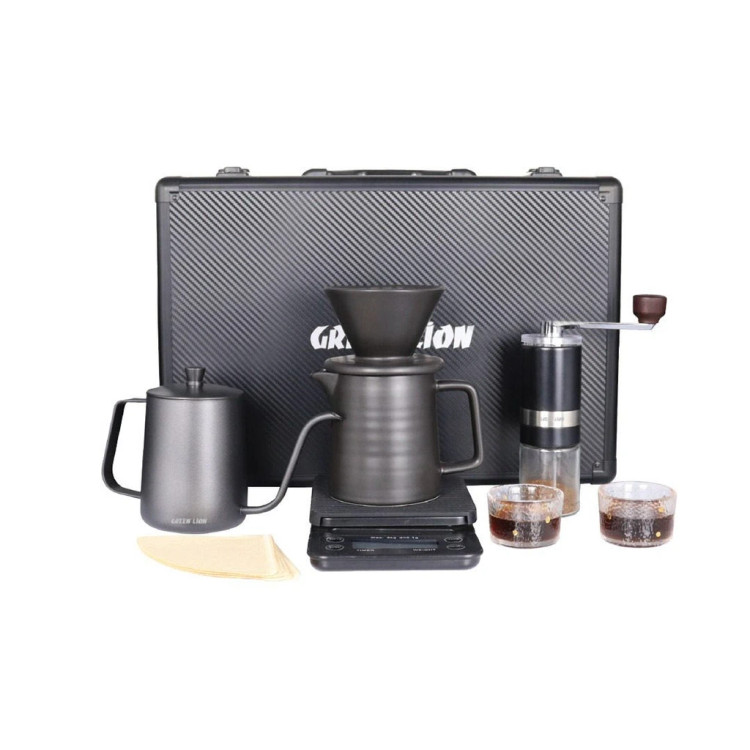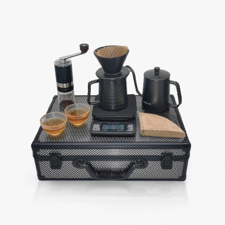 کتری، آسیاب دستی، قطرهچکان، سرور، ترازو، 40 فیلتر، 2 فنجان، جعبه حمل