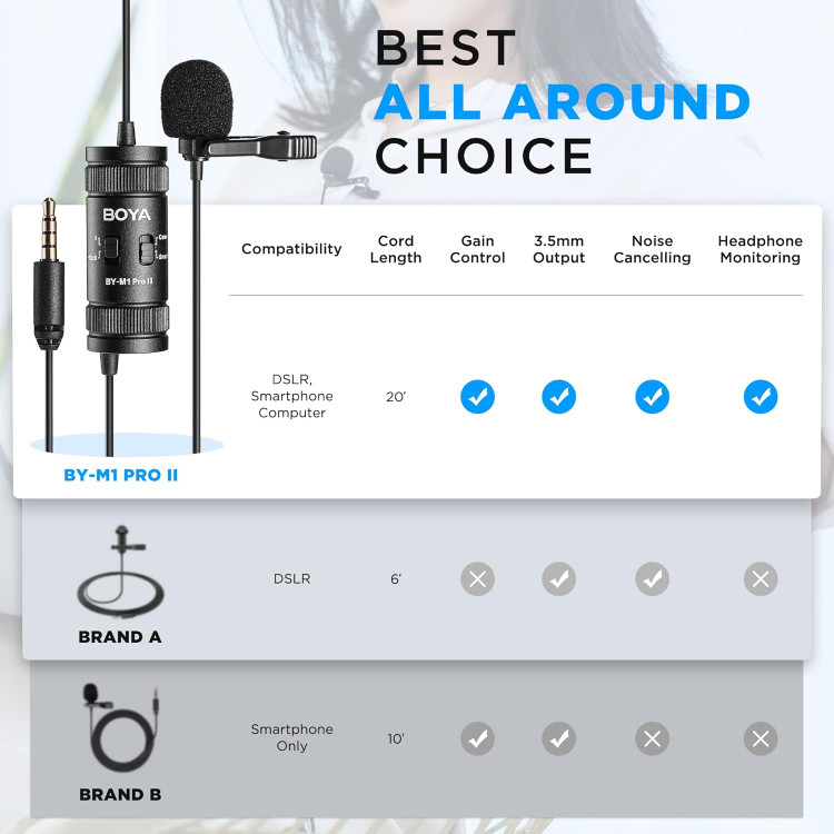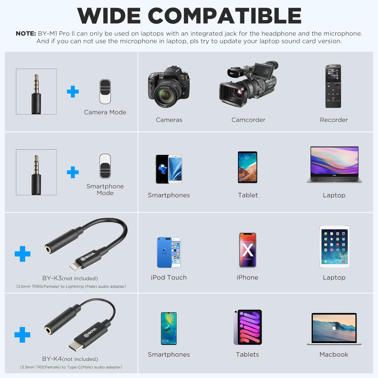 BY-M1 Pro II با طیف وسیعی از دستگاهها از جمله گوشیهای هوشمند، دوربینها، کامپیوترها و لپتاپها سازگار است. این ویژگی آن را برای استفادههای مختلف مناسب کرده است.