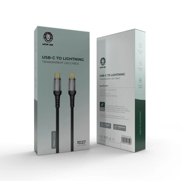 کابل شارژ Green Lion تایپسی به لایتنینگ شفاف با LED، طول ۱ متر، توان ۲۷ وات PD