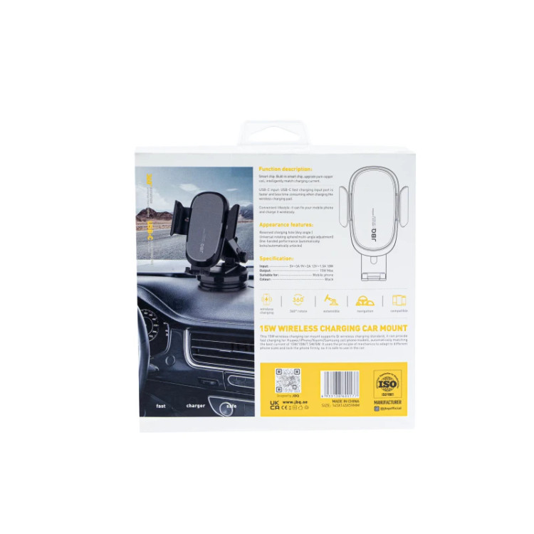 پایه نگهدارنده و شارژر وایرلس خودرو JBQ مدل MW21-1 با توان ۱۵ وات و قفل جاذبهای، چرخش ۳۶۰ درجه و پورت USB-C