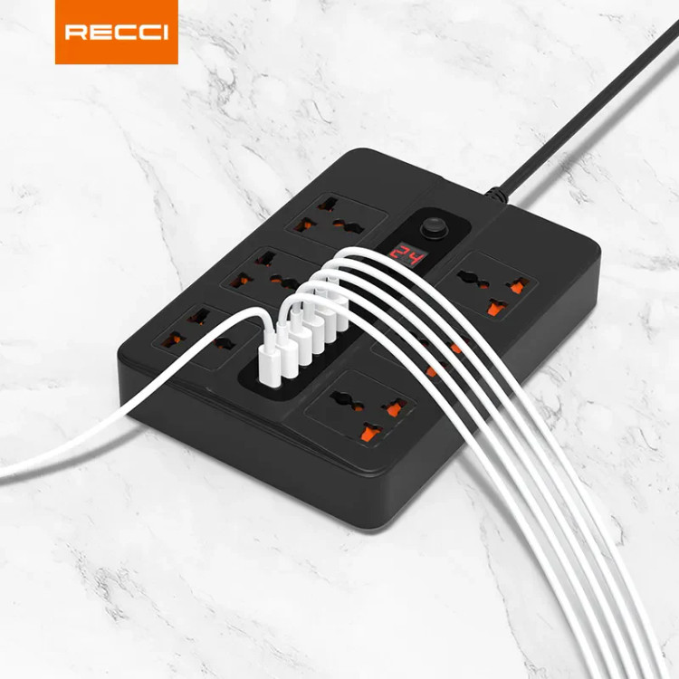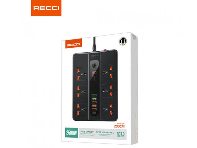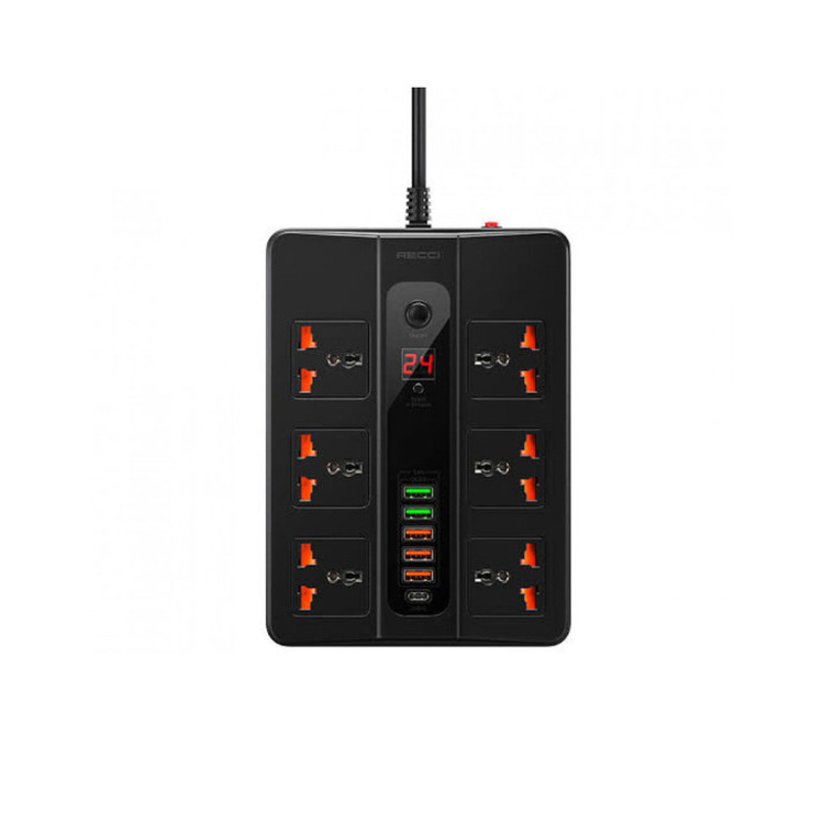 چندراهی برق Recci RC07 با ۶ پریز، ۵ پورت USB و تایمر دیجیتال – توان ۲۵۰۰ وات