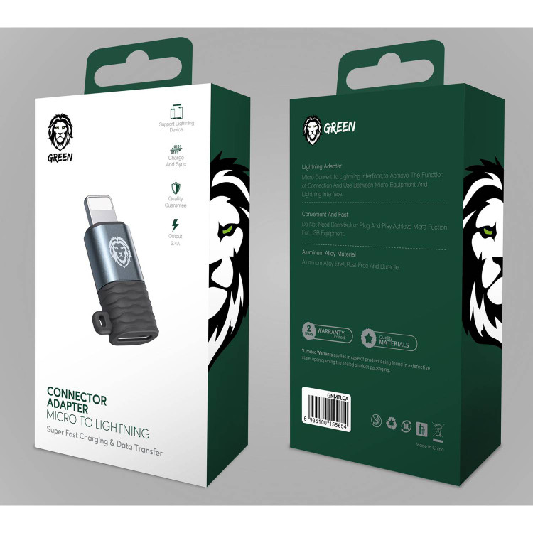 مبدل Micro USB به Lightning گرین لاین (Green Lion) با شارژ سریع 2.4A و انتقال دیتا